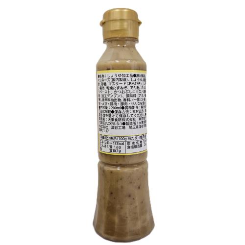 マヨネーズ(国内製造)、しょうゆ、醸造酢、砂糖、マスタード(あらびき)、レモン果汁、乾燥たまねぎ、でん粉、ミルポワペースト、かつおぶしエキス/、増粘剤(加工デンプン)、調味料(アミノ酸等)、香辛料抽出物、香料、(一部に小麦・卵・大豆・鶏肉・豚肉・りんごを含む)